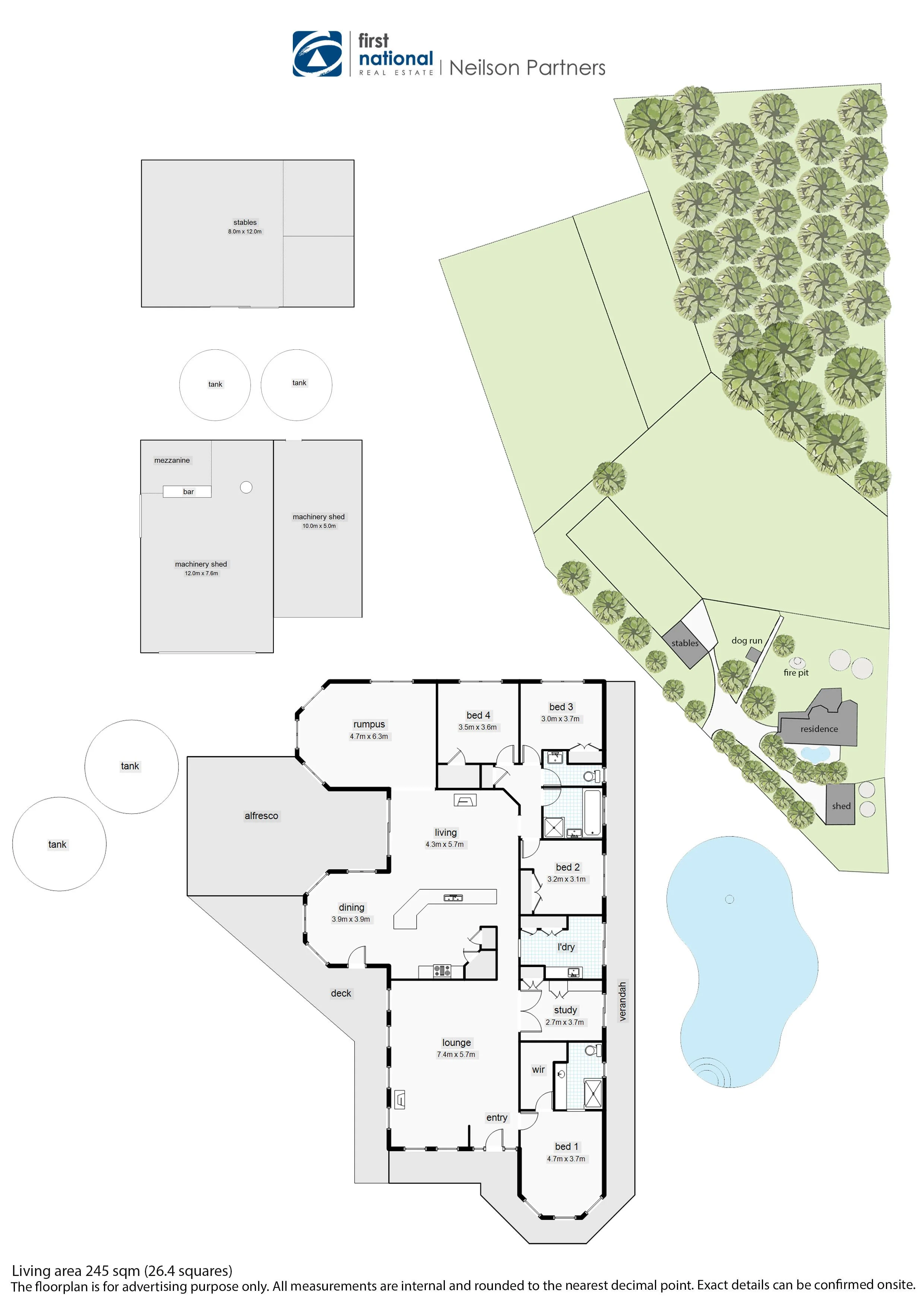 A stylish image showcasing the floorplan of the house and all outbuildings, available in landscape and portrait styles.